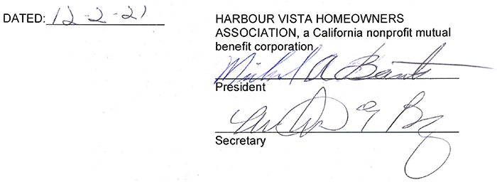 This First Amendment Declaration of Covenants, Conditions and Restrictions and Reservation of Easements of Harbour Vista Homeowners Association (“First Amendment”) is made on the date set forth at the end of this document by Harbour Vista Homeowners Association, a California nonprofit mutual benefit corporation (referred to in this document as the “Association”).